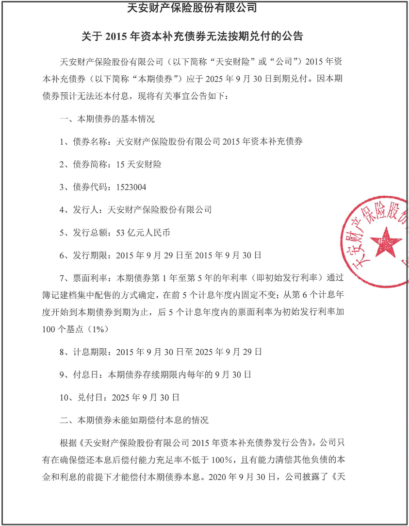 "明天系"旗下的天安财险,宣布一笔资本补充债券无法按期兑付。保险业现首例违约。 9月30日,天安财产保险股份有限公司发布《关于2015年资本补充债券无法按期兑付的公告》。公告称,该公司2015年资本补充债券应于2025年9月30日到期 兑付,预计无法还本付息。 该债权的债券代码为1523004,发行人为天安财产保险股份有限公司,发行总额53亿元人民币。发行期限为2015年9月29日至2015年9月30日。计息期限为 2015年9月30日至2025年9月29日。付息日为本期债券存续期限内每年的9月30日。兑付日为2025年9月30日。 本期债券第1年至第5年的年利率(即初始发行利率)通过簿记建档集中配售的方式确定,在前5个计息年度内固定不变。从第6个计息年度开始到本期债券到 期为止,后5个计息年度内的票面利率为初始发行利率加100个基点(1%)。 根据《天安财产保险股份有限公司2015年资本补充债券发行公告》,公司只有在确保偿还本息后偿付能力充足率不低于100%,且有能力清偿其他负债的本 金和利息的前提下才能偿付本期债券本息。 2020年9月30日,公司披露了《天安财产保险股份有限公司关于"15天安财险"计息挂 ...