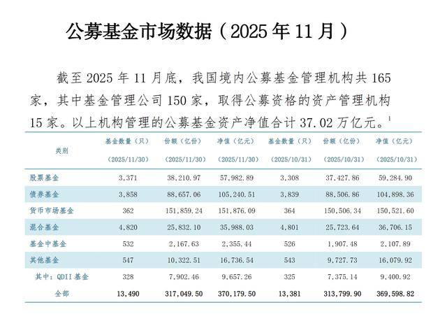 中国证券投资基金业协会网站最新发布的公募基金市场数据显示,截至2025年11月底,我国公募基金总 规模为37.02万亿元,这是我国公募基金总规模今年以来第八次创下历史新高。 分类型来看,今年11月货币基金规模增长超1300亿元,贡献最大规模增量,此外债券基金、FOF、QDII 基金的规模也实现小幅增长。而股票基金和混合基金规模在11月分别下降1302亿元和718亿元。 | 英别 | 基金数量(只) | 份额(亿份) | | 净值(亿元) 基金数量(只) | 份额(亿份) | 净值(亿元) | | --- | --- | --- | --- | --- | --- | --- | | | (2025/11/30) | (2025/11/30) | (2025/11/30) | (2025/10/31) | (2025/10/31) | (2025/10/31) | | 股票基金 | 3,371 | 38,210. 97 | 57.982.89 | 3.308 | 37.427.86 | 59.284.90 | | 债券基金 | 3.858 | 88.657.06 | 105,240,51 | 3.839 | 8 ...