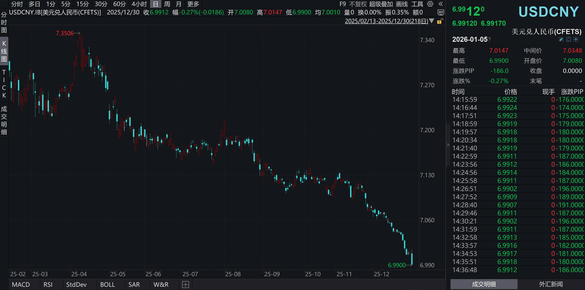 对于近期人民币对美元汇率连续升值并升破7.0关口,国盛证券研报指出,原因主要有两方面:一是美元走弱。美元从2025年1月中旬就已开始明显转弱,但 人民币4月以后才开始升值,主要因为关税因素影响,本轮人民币升值可视作美元走弱的滞后反映。近期美元再度回落,一方面是因为12月美联储鸽派降 息,另一方面是因为近期美国经济表现弱于欧洲。二是集中结汇。4月以来,随着关税问题缓和、资本回流、年底结汇高峰等因素,结售汇顺差明显增加, 助推了人民币升值。 央广网北京12月30日消息(记者 冯方)12月30日,继前两日离岸人民币对美元"破7"之后,在岸人民币对美元也升破这一重要整数关口。Wind数据显示,在 岸人民币对美元汇率盘中最高触及6.9900,创下2023年5月18日以来新高。 在岸人民币对美元汇率近一年来走势(截图自Wind) 近期召开的央行货币政策委员会2025年第四季度例会指出,下阶段,要增强外汇市场韧性,稳定市场预期,防范汇率超调风险,保持人民币汇率在合理均衡 水平上的基本稳定。 对于人民币升值的影响,国盛证券研报认为,股市方面,人民币升值将对A股形成利好,主要有两条传导路径:一是人民币升值有利于吸引外资流入,二 ...
