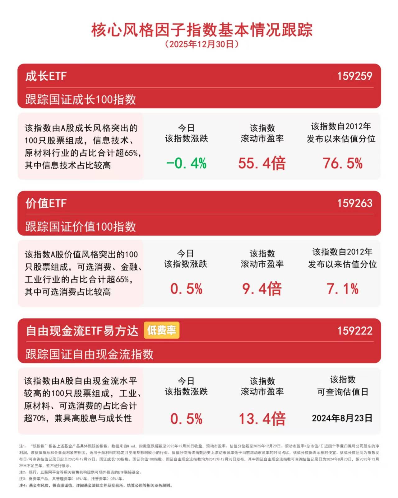 | 成长ETF | | | | | --- | --- | --- | --- | | 跟踪国证成长100指数 | | | | | 该指数由A股成长风格突出的 | 令日 | 该指数 | 该指数目 | | 100只股票组成,信息技术、 | 该指数涨跌 | 滚动市盈率 | 发布以来 | | 原材料行业的占比合计超65%, 其中信息技术占比较高 | -0. 4% | 55.4倍 | 76. | | 价值ETF | | | | | 跟踪国证价值100指数 | | | | | 该指数A股价值风格突出的100 | ▽日 | 该指数 | 该指数 | | 只股票组成,可选消费、金融、 | 该指数涨跌 | 滚动市盘率 | 发布以来 | | 工业行业的占比合计超65%, 其中可选消费占比较高 | 0. 5% | 9.4倍 | | | 自由现金流ETF易方达 | | | | | 跟踪国证自由现金流指数 | | | | | 该指数由A股自由现金流水平 | マ日 | 该指数 | 该 | | 较高的100只股票组成,工业、 | 该指数涨跌 | 滚动市盈率 | 可查询 | | 原材料、可选消费的占比合计 | | | | | 超70%,兼具 ...