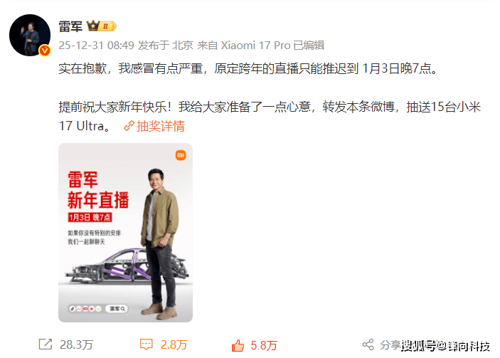 1、雷军因病推迟跨年直播 2025年的最后一天,国产各品牌都在持续战斗之中。本来今天晚上雷军是要进行跨年直播的,不过由于不可抗力的原因推迟了。下面对大家盘点一下今天国 产手机圈的大事。 3、vivo征集用vivo拍的跨年 雷军表示:实在抱歉,我感冒有点严重,原定跨年的直播只能推迟到 1月3日晚7点。提前祝大家新年快乐!我给大家准备了一点心意,转发本条微博,抽送 15台小米17 Ultra。 这个真的没办法,雷军的道歉一出全网都表示理解,毕竟这是不可抗力的原因,且雷军诚意十足给大家准备了整整15台小米17 Ultra作为 奖品。 说到雷军跨年直播推迟,其实今天小米还为小米17 Pro系列用户准备了一个惊喜。那就是新年Flag模板全新上线,大家可以进入设置-妙享背屏-背屏个性化- 新年Flag,选择图片模板输入你的新年目标,一键应用。官方称:让背屏帮你记录目标,奔赴更好的2026,大家可以晒一下,你的新年Flag是什么?另外在 新年来临之际小米把徕卡影像大赛的精彩时刻,印成为了一张张"小米新年明信片",从现在起大家就可以到线下小米之家进行领取,共准备了100万份。 2、OPPO多款新品开售 OPPO今天有多款新品 ...