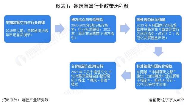 文章核心观点 - 中国潮玩盲盒行业政策发展历经从早期监管空白到构建全国性规范体系的演变,当前呈现“规范与创新并重、本土与国际联动”的格局,政策核心在于构建覆盖全产业链的监管框架,同时鼓励文化赋能与产业出海 [1][4] 政策发展历程 - 2019年以前行业依赖通用法规与市场自发调节,处于早期监管空白与行业自律阶段 [1] - 2020-2022年进入地方试点与专项整治期,2021年上海发布全国首个地方盲盒经营合规指引 [1] - 2023年国家市场监督管理总局出台《盲盒经营行为规范指引(试行)》,标志着全国性规范体系构建 [1] - 2025年政策方向聚焦文化赋能与出海支持,提出“潮玩+非遗”模式,并推进标准细化与国际接轨 [1] 国家层面政策核心内容 - 2023年6月发布的《盲盒经营行为规范指引(试行)》是行业核心规范,明确了经营原则、禁止销售内容、信息公示、价格规范及未成年人保护等关键方面 [4][5] - 2025年商务部政策设立10亿元IP出海基金,目标到2030年行业海外收入占比超过30%,支持潮玩IP通过本土化改造进入全球市场 [4][5] - 2024年国务院政府工作报告及系列文件将“国货‘潮品’”培育为新的消费增长点,鼓励潮玩与中华优秀传统文化、地方特色文化深度融合 [5] - 2023年7月《轻工业稳增长工作方案》提出激发玩具消费、稳定进出口、培育产业集群等重要任务,并推动新国潮、博物馆等IP品牌授权 [5][7] - 政策涵盖支持性与规范性,支持性政策鼓励产业融合与消费增长,规范性政策着重产品质量安全、过度包装治理及未成年人保护 [5][6] 各省市层面政策特点 - 政策呈现“国家框架+地方特色”的治理格局,上海、东莞等地区通过专项政策引领行业规范与产业升级 [11][13] - 北京市平谷区2025年推出未成年人保护专项行动,要求商家在显著位置标注“8周岁以上未成年人购买需监护人同意”,并禁止向未经同意的未成年人出售盲盒,学校周边50米内限制销售 [13] - 广东省东莞市2023年出台措施加快潮玩产业发展,对品牌推广、展会参展等给予最高100万元补贴,并鼓励企业拥有5个以上市场化IP,目标打造“中国潮玩之都” [13] - 浙江省2023年通过企业签订承诺书进行规范,鼓励设定单次消费不超过500元的抽取金额上限,并建立10次内必中隐藏款的保底机制 [15] - 各地区发展侧重点多样,北京推进电竞潮玩主题片区建设;黑龙江、吉林开展市场整治;陕西、贵州挖掘本土文化赋能;江苏严控高价值盲盒入境;海南、广西探索潮玩与旅游融合 [15]
