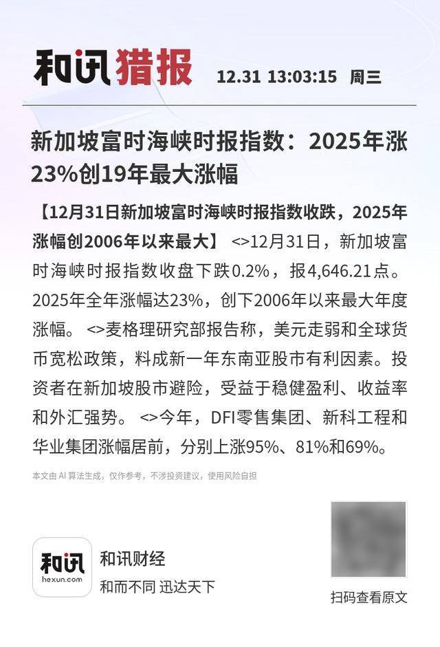 【12月31日新加坡富时海峡时报指数收跌,2025年涨幅创2006年以来最大】12月31日,新加坡富时海峡 时报指数收盘下跌0.2%,报4,646.21点。2025年全年涨幅达23%,创下2006年以来最大年度涨幅。>麦格 理研究部报告称,美元走弱和全球货币宽松政策,料成新一年东南亚股市有利因素。投资者在新加坡股 市避险,受益于稳健盈利、收益率和外汇强势。>今年,DFI零售集团、新科工程和华业集团涨幅居 前,分别上涨95%、81%和69%。> 本文由 Al 算法生成,仅作参考,不涉投资建议,使用风险自担 和讯财经 和而不同 迅达天下 本文由 AI算法生成,仅作参考,不涉投资建议,使用风险自担 扫码查看原文 和讯猎报 12.31 13:03:15 周三 新加坡富时海峡时报指数:2025年涨 23%创19年最大涨幅 【12月31日新加坡富时海峡时报指数收跌,2025年 涨幅创2006年以来最大】 <>12月31日,新加坡富 时海峡时报指数收盘下跌0.2%,报4,646.21点。 2025年全年涨幅达23%,创下2006年以来最大年度 涨幅。<>麦格理研究部报告称,美元走弱和全球货 币宽松政策,料成新一年东南亚股市 ...