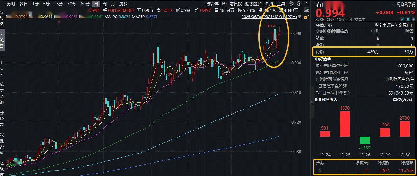 值得关注的是,截至发稿,有色ETF华宝(159876)获资金实时净申购360万份,此前5日亦吸金8571万元,反映资金期待有色金属板块后市表现,积极进场 布局! 今日(12月31日)揽尽有色金属行业龙头的有色ETF华宝(159876)场内价格盘中涨超2.5%,现涨0.81%,继续刷新上市以来的高点! 风险提示:有色龙头ETF及其联接基金被动跟踪中证有色金属指数,该指数基日为2013.12.31,发布于2015.7.13,指数近5个完整年度的涨跌幅为:2020年, 35.84%;2021年,35.89%;2022年,-19.22%;2023年,-10.43%;2024年,2.96%,指数成份股构成根据该指数编制规则适时调整,其回测历史业绩不预示 指数未来表现。本文中指数成份股仅作展示,个股描述不作为任何形式的投资建议,也不代表管理人旗下任何基金的持仓信息和交易动向。基金管理人评估 的该基金风险等级为R3-中风险,适宜平衡型(C3)及以上的投资者,适当性匹配意见请以销售机构为准。任何在本文出现的信息(包括但不限于个股、评 论、预测、图表、指标、理论、任何形式的表述等)均只作为参考,投资人须对任何自主决定的投资行为 ...