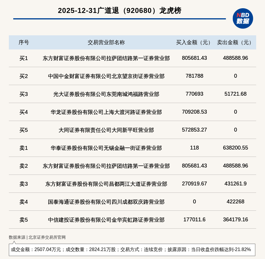 免责声明:本文内容与数据仅供参考,不构成投资建议,使用前核实。据此操作,风险自担。 每日经济新闻 (记者 曾健辉) 每经讯,2025年12月31日,北交所上市公司广道退(920680,收盘价:0.86元)登上龙虎榜,交易方式是连续竞价,披露原因是 当日收盘价跌幅达到-21.82%,成交数量2824.21万股,成交金额2507.04万元。买一席位为东方财富证券股份有限公司拉萨团结 路第一证券营业部,买入80.57万元;卖一席位为华泰证券股份有限公司无锡金融一街证券营业部,卖出63.82万元。 | | 2025-12-31广道退 (920680) 龙虎榜 | | | | --- | --- | --- | --- | | 序号 | 交易营业部名称 | 买入金额(元) | 卖出金额(元) | | न्द्र ग | 东方财富证券股份有限公司拉萨团结路第一证券营业部 | 805681.43 | 488588.96 | | 买2 | 中国中金财富证券有限公司北京望京街证券营业部 | 781788 | 0 | | 址3 | 光大证券股份有限公司东莞南城鸿福路营业部 | 770693 | 51721.68 | | द्र ...