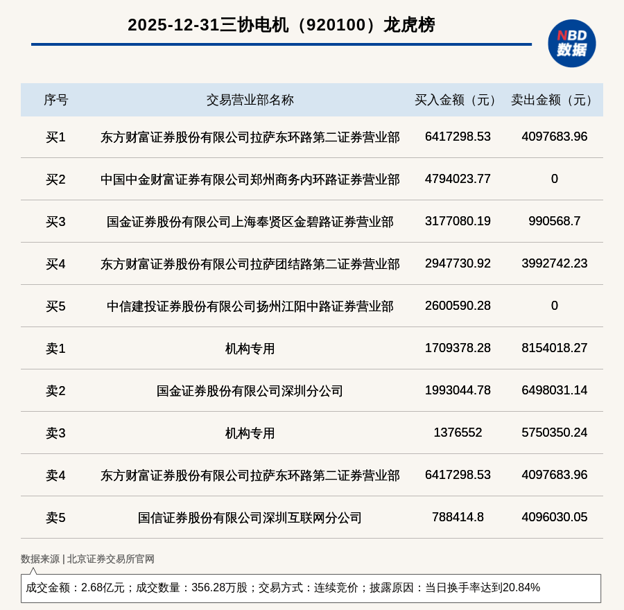 免责声明:本文内容与数据仅供参考,不构成投资建议,使用前核实。据此操作,风险自担。 每经讯,2025年12月31日,北交所上市公司三协电机(920100,收盘价:73.66元)登上龙虎榜,交易方式是连续竞价,披露原 因是当日换手率达到20.84%,成交数量356.28万股,成交金额2.68亿元。买一席位为东方财富证券股份有限公司拉萨东环路第二 证券营业部,买入641.73万元;卖一席位为机构专用,卖出815.4万元。 每日经济新闻 | | 2025-12-31三协电机 (920100) 龙虎榜 | | | | --- | --- | --- | --- | | | 交易营业部名称 | 买入金额(元) | 卖出金额(元) | | न्द्र ग | 东方财富证券股份有限公司拉萨东环路第二证券营业部 | 6417298.53 | 4097683.96 | | | 中国中金财富证券有限公司郑州商务内环路证券营业部 | 4794023.77 | 0 | | | 国金证券股份有限公司上海奉贤区金碧路证券营业部 | 3177080.19 | 990568.7 | | 24 | 东方财富证券股份有限公司拉萨团结路第二证券营 ...