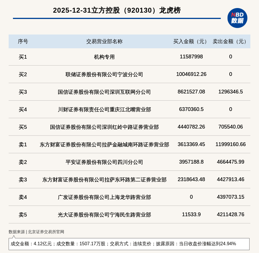 (记者 曾健辉) | 2025-12-31立方控股 (920130) 龙虎榜 | | | | --- | --- | --- | | 交易营业部名称 | 买入金额(元) | 卖出金额(元) | | 机构专用 | 11587998 | O | | 买2 联储证券股份有限公司宁波分公司 | 10046912.26 | 0 | | 国信证券股份有限公司深圳互联网分公司 | 8621527.08 | 1296346.5 | | 川财证券有限责任公司重庆江北嘴营业部 | 6370360.5 | 0 | | 国信证券股份有限公司深圳红岭中路证券营业部 | 4440782.26 | 705540.06 | | 东方财富证券股份有限公司拉萨金融城南环路证券营业部 | 3613369 45 | 11999160.66 | | 平安证券股份有限公司四川分公司 | 3957188.8 | 4664475.99 | | 东方财富证券股份有限公司拉萨东环路第二证券营业部 | 2318643.48 | 4427913.46 | | 广发证券股份有限公司上海龙华路营业部 数据来源 北京证券交易所官网 | 0 | 4397073.15 | ...