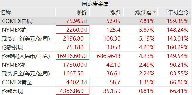 近期贵金属价格波动 - 受美国芝商所上调金属期货履约保证金影响,大量投资者在新规生效前卖出,导致12月29日国际贵金属价格大幅下跌 [1] - 12月30日,国际黄金、白银价格出现反弹,纽商所明年3月交割的白银期货价格报每盎司74.42美元,涨幅达5.62% [1] - 12月30日,纽商所明年2月交割的黄金期货价格报每盎司4402.1美元,涨幅达1.35% [1] - 12月30日,国际铜价也出现反弹,纽商所明年3月交割的铜期货价格报每磅5.6945美元,涨幅达2.30% [1] 贵金属市场年度表现 - 黄金正经历自1979年以来表现最好的一年,金价于12月突破历史新高,截至发稿现货黄金年内涨幅已超66% [2] - 今年以来,铂金涨幅高达141.57% [3] - 今年以来,白银期货涨幅超150%,成为全球涨幅最高的资产 [3] - COMEX白银年初至今涨幅达159.35%,伦敦银现年初至今涨幅达160.29% [2] - NYMEX铂年初至今涨幅达148.24%,现货铂金年初至今涨幅达143.01% [2] - COMEX黄金年初至今涨幅达66.80%,伦敦金现年初至今涨幅达66.41% [2] 机构对未来价格的展望 - 瑞银在最新报告中将2026年前三季度黄金价格预期上调至每盎司5000美元 [3] - 瑞银认为,若政治或经济动荡加剧,黄金价格可能涨至每盎司5400美元 [3] - 道明证券的大宗商品分析师在其2026年展望中预计,白银价格在未来一年将放缓至40美元左右 [3] - 中信建投证券在上周的研报中提示,白银的波动率指数处于历史极大值,要警惕超买后的回调风险 [3]