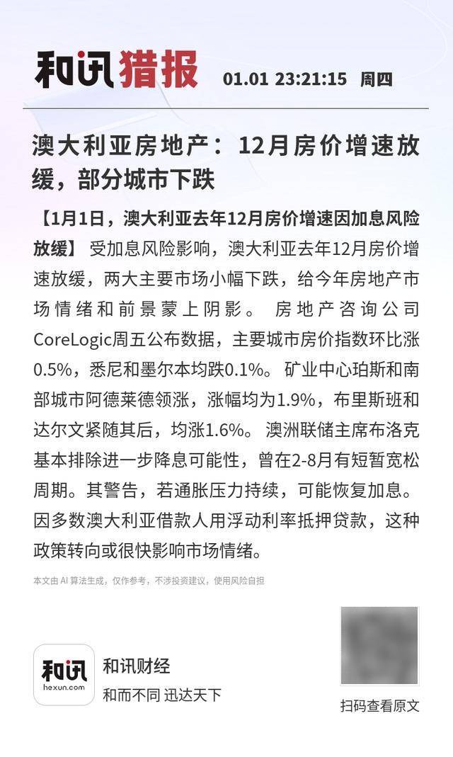 澳大利亚房地产市场整体表现 - 2023年12月澳大利亚主要城市房价指数环比上涨0.5% [1] - 全国房价增速因加息风险影响而放缓 [1] 主要城市房价分化表现 - 悉尼和墨尔本两大主要市场房价环比均下跌0.1% [1] - 珀斯和阿德莱德领涨全国,房价环比涨幅均为1.9% [1] - 布里斯班和达尔文紧随其后,房价环比均上涨1.6% [1] 货币政策与市场前景 - 澳大利亚联储主席基本排除了进一步降息的可能性 [1] - 澳大利亚联储曾在2023年2月至8月有过短暂的宽松周期 [1] - 若通胀压力持续,澳大利亚联储可能恢复加息 [1] - 由于多数澳大利亚借款人使用浮动利率抵押贷款,政策转向可能很快影响市场情绪 [1]