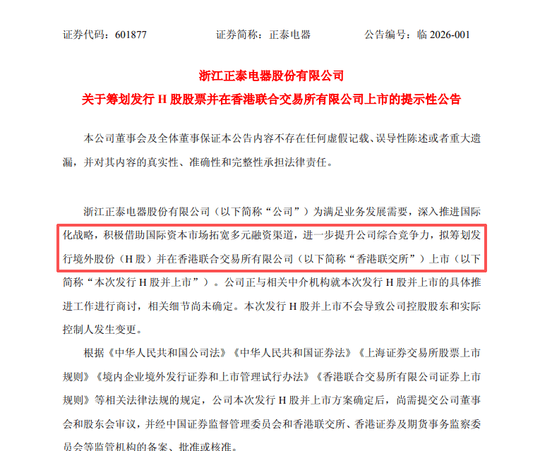 又一行业龙头,寻求港股上市! 《公告》显示,为满足业务发展需要,深入推进国际化战略,积极借助国际资本市场拓宽多元融资渠道,进一步提升公司综合竞争力,正泰电器拟筹划发 行境外股份(H股)并在香港联合交易所有限公司(简称"香港联交所")上市。 另值得关注的是,正泰居家是正泰在民用板块的核心品牌,其以泛家居领域产品及服务为核心,产品涵盖开关、照明、排插、智能锁等智能家居及泛居家 领域产品,销售覆盖线上主流电商平台与行业最密集的线下渠道经销网络,致力于成为家居电气一体化解决方案及电力行业全产业链线上线下平台服务提 供商。 此外,正泰电器还指出,本次发行H股并上市能否通过审议、备案和审核程序并最终实施具有较大不确定性。公司将依据相关法律法规的规定,根据本次 发行H股并上市的后续进展情况及时履行信息披露义务,敬请广大投资者理性投资,注意投资风险。 推广 图源 | 东方财富网 正泰电器表示,截至目前,公司正与相关中介机构就本次发行H股并上市的具体推进工作进行商讨,相关细节尚未确定。本次发行H股并上市不会导致公 司控股股东和实际控制人发生变更。 正泰集团,始创于1984年,是全球知名的智慧能源系统解决方案提供商,其深入践行" ...