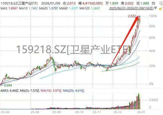 板块内,海兰信、航天电器、航天电子等成分股领涨,共同驱动ETF创出新高。本轮行情的核心驱动力 在于产业基本面的根本性变化与资本市场的重估。 1月8日午后,A股市场卫星产业板块表现强势。截至13时11分,跟踪中证卫星产业指数的全市场首只卫 星产业ETF(159218)盘中成交价突破2元整数关口,这标志着该产品自成立以来复权单位净值实现翻 倍,成为首只达成这一里程碑的卫星主题ETF。当日该ETF上涨4.46%,成交额超过6.4亿元,资金参与 热情高涨。 卫星产业ETF此番突破2元关口,不仅是产品自身的重要节点,也是市场对商业航天产业从预期导入迈 向规模成长阶段的关键确认。 风险提示:基金有风险,投资需谨慎。 分析强调,在产业爆发初期,市场基于长远前景给予估值溢价是合理现象,这也体现了资本市场在前瞻 性配置战略资源中的作用。未来,随着产业逐步成熟,投资逻辑将从主题概念向业绩成长与兑现过渡, 围绕"制造-组网-应用"的核心链条,行业有望步入高质量发展的黄金阶段。 ...