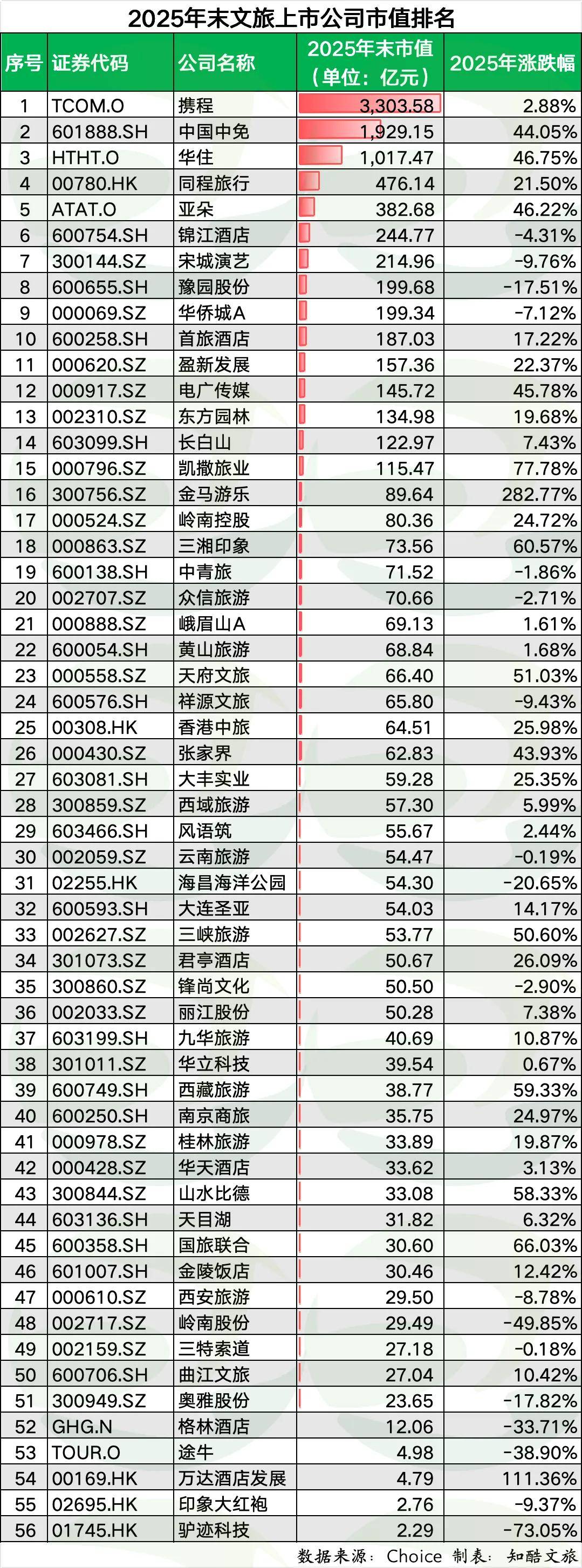 2025年文旅上市公司市值排名总览 - 文章汇总了56家A股、港股及美股文旅上市公司2025年末的市值数据 [1] - 携程以3303.58亿元市值稳居榜首,中国中免以1929.15亿元位列第二,华住以1017.47亿元位列第三 [1][2] - 市值排名前十的公司主要为在线旅游企业、连锁酒店集团及旅游零售商,包括同程旅行(476.14亿元)、亚朵(382.68亿元)、锦江酒店(244.77亿元)、宋城演艺(214.96亿元)、豫园股份(199.68亿元)、华侨城A(199.34亿元)和首旅酒店(187.03亿元) [2][4] 文旅上市公司市值分布与结构 - 共有15家公司市值突破百亿元,21家公司市值在50亿至100亿元之间,16家公司市值在10亿至50亿元之间,4家公司市值低于10亿元 [5] - 文旅上市公司市值中位数为57亿元,低于A股全行业公司67亿元的市值中位数 [5] - 携程、中国中免和华住是仅有的三家市值超过1000亿元的文旅上市公司 [4] 2025年文旅上市公司市值涨跌幅分析 - 在56家公司中,2025年共有38家公司市值上涨,18家公司市值下跌 [5] - 市值涨幅前三名分别为:金马游乐(上涨282.77%)、万达酒店发展(上涨111.36%)、凯撒旅业(上涨77.78%) [5][6] - 市值跌幅前三名分别为:驴迹科技(下跌73.05%)、岭南股份(下跌49.85%)、途牛(下跌38.90%) [5][8] - 整体来看,50%的文旅公司(28家)市值涨幅超过10% [13] 不同细分领域公司表现 - **在线旅游**:携程全年涨幅仅为2.88%,同程旅行涨幅为21.50% [7][10] - **连锁酒店**:华住与亚朵涨幅显著,分别为46.75%和46.22% [6][10] - **旅游零售**:中国中免市值上涨44.05%,主要受益于海南正式封关对其离岛免税业务的利好 [10] - **旅行社**:凯撒旅业暴涨77.78%,可能因其总部迁至海南而成为“海南封关概念股”;众信旅游下跌2.71%,反映跟团游市场竞争加剧、利润承压 [11] - **景区公司**:西藏旅游、天府文旅、三峡旅游涨幅显著,分别为59.33%、51.03%和50.60%;张家界在破产重整风波中仍上涨43.93% [10] 市场异动与潜在黑马分析 - 金马游乐以282.77%的涨幅成为年度“黑马”,但其2025年前三季度营收仅5.7亿元,同比增长23.76%,业务模式未见重大突破,股价大涨原因被归因于市场情绪 [8] - 万达酒店发展市值上涨111.36%,但市值规模较小,仅为4.79亿元 [5][6] - 高涨幅公司普遍为小盘股,但中国中免(1929亿元)和华住(1017亿元)作为大市值公司也实现了超过44%的显著涨幅,呈现“大象起舞” [10] 行业整体表现与市场对比 - 文旅行业作为消费领域的传统行业,在2025年资本市场上并非热点 [13] - 尽管半数公司实现超10%的涨幅,但对比上证指数全年18.3%的涨幅和纳斯达克指数20.36%的涨幅,文旅板块整体表现相对落后 [13] - A股和纳斯达克市场的高涨幅主要由AI、科技和新制造等概念驱动 [13]