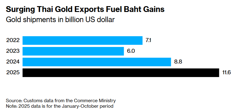 东南亚核心主权货币之一泰铢正迈向八年来兑美元的最大年度涨幅,2025年迄今,泰铢兑美元涨幅已经高达 10%,同期涨势罕见同时胜过新加坡元以及马来西亚令吉、印度尼西亚盾,堪称东南亚最强货币。乍看之下,几 乎没有什么能够解释其相较东南亚区域主权货币的出色表现。泰国经济远非强劲增长可言,并且受到旅游业持续 疲软、高家庭负债以及对美国出口被征收19%关税的重大拖累。 在华尔街分析师们看来,泰铢的这轮罕见货币走势部分主要由金价上涨以及特朗普关税政策"意外带来的提振效 应"所推动,并且泰铢汇率上行正使这个东南亚国家重点依赖的出口型制造商竞争力下降,并加剧了新任总理阿 努廷.查恩维拉库尔所面临的挑战——其领导的泰国政府将在2月面对一场提前选举。 为何泰铢如此强势? 泰国货币在2024年年中开始兑美元持续走强,差不多就在政府推出经济刺激计划推动出口规模,以及交易员们在 美联储最新一轮降息周期之前开始抛售美元的同时期。今年以来,外汇交易员们对于美元作为储备货币地位的疑 虑也为这轮上涨提供了强大支撑。 强势泰铢会有什么问题吗? 泰铢近期的大部分涨势由金价(黄金兑美元)大幅上涨带来的外溢效应,与美国劳动力市场走软所推动——美国就 ...