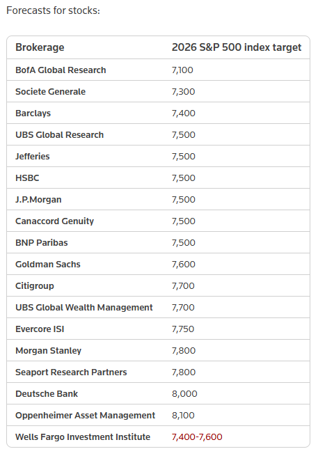 | Brokerage | 2026 S&P 500 index target | | --- | --- | | BofA Global Research | 7,100 | | Societe Generale | 7,300 | | Barclays | 7,400 | | UBS Global Research | 7,500 | | Jefferies | 7,500 | | HSBC | 7,500 | | J.P.Morgan | 7,500 | | Canaccord Genuity | 7,500 | | BNP Paribas | 7,500 | | Goldman Sachs | 7,600 | | Citigroup | 7,700 | | UBS Global Wealth Management | 7,700 | | Evercore ISI | 7,750 | | Morgan Stanley | 7,800 | | Seaport Research Partners | 7,800 | | Deutsche Bank | 8,000 | | Oppenheimer Asset ...
