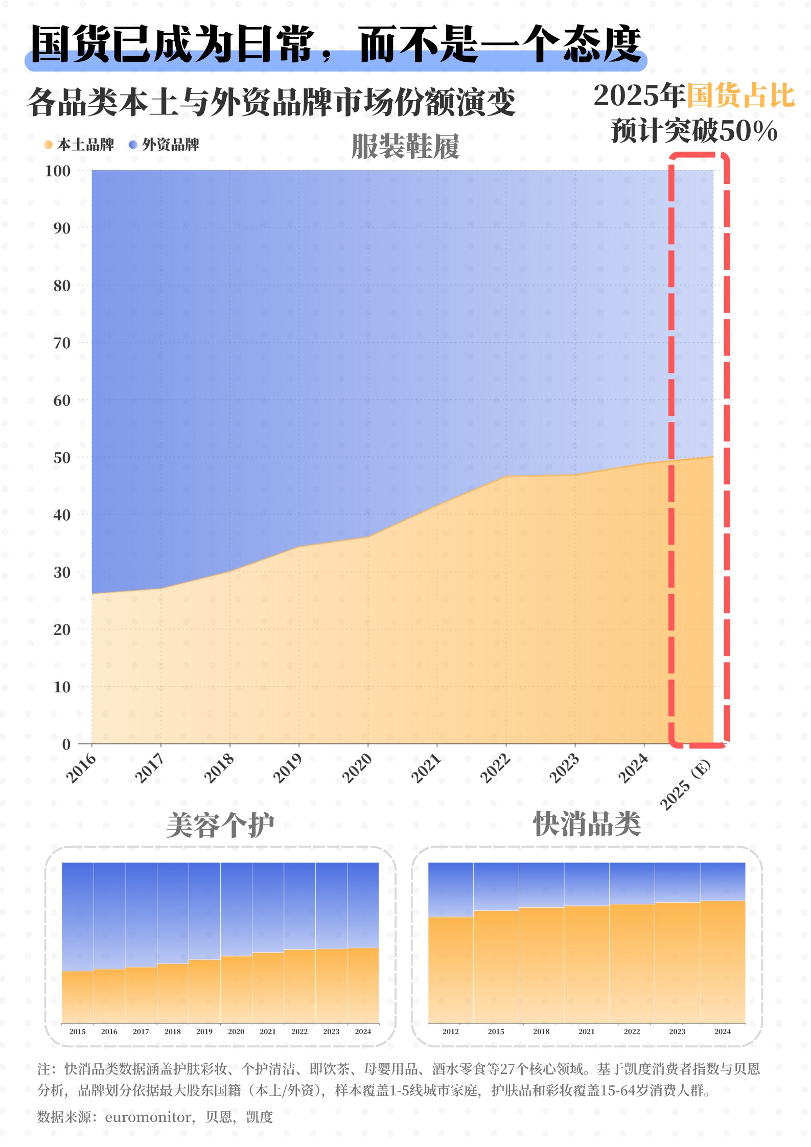 "透视图"栏目在年终特别策划了"36氪年度透视"系列,用数据透视2025全年趋势,以图片呈现今年商业世界中不可错过的要点。 这是我们的第7期内容。 作者|贺哲馨 当"国货"从一种情怀沉淀为生活的背景色,中国消费市场正迎来一场静默而深刻的权力更迭。 据Euromonitor数据显示,2012年至2024年间,在涵盖护肤、彩妆等27个快消品类中,本土品牌的市场份额已从66%稳步攀升至76%。尤其在服饰鞋履赛道, 2025年将迎来一个历史性的分水岭:本土品牌预计将占据50%的江山,正式与外资平分秋色。 然而,覆盖变广了,并不等同于真正变强了。 奢侈品 0 0 6 ● 美妆个护 0 C B 0 本土品牌集 场蛋糕被大 0 服饰鞋包 0 摊,缺乏强 O ® 0 0 0 0 数据来源: euromonitor, 2024 U 36氪制图 透过数据我们发现,国货的"主场时代"仍带着明显的结构性阵痛: 36氪制图 大而不强:相比于外资巨头极高的品牌势能,本土服饰鞋履品牌表现出明显的"长尾效应"。前20大品牌市场份额(CR20)仅占不到16%,大量中小品 牌在摊薄利润的同时,也让市场缺乏具有绝对统治力的领军者。 36氪制图 昂 ...