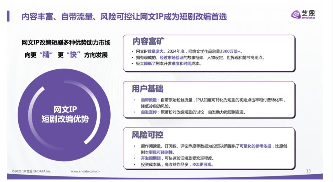 01 《十八岁太奶奶驾到,重整家族荣耀》《盛夏芬德拉》《好孕甜妻被钻石老公宠上天》 —— 当你为这些爆款短剧上头不已时,或许未曾留意,它们背后 都站着同一个 "幕后玩家"——网文平台。 你可能从未点开过一部网络小说,但重生、穿越、种田等经典网文元素,正在通过短剧这一新的跳板,悄然承包你的娱乐日常。 2025年,网文平台正在为短剧行业最核心的IP供给池,用多年积累的题材富矿和设定创意,为陷入同质化的短剧输送源头活水。艺恩数据发布的《2025年 中国网文IP短剧开发价值报告》显示,网文平台微短剧改编授权同比增长81%,呈现进一步爆发之势。 2025年,阅文等网文行业头部玩家分化出全产业链、数据驱动等多元路径,一边搭建自有分发闭环,一边敞开IP库拥抱共创,网文与短剧的双向赋能,推 动行业从粗放增长迈向IP精耕的新阶段。 短剧争抢头部网文IP 3300万部作品成题材富矿 2025年,短剧市场即将触碰千亿规模天花板,然而转型升级的紧迫感也日甚一日,仅靠强刺激爽点的套路化内容逐渐失灵,拥有情感共鸣、强人设与完整 世界观的IP改编作品,以及系列化开发模式,成为突破行业瓶颈的关键。 网文IP自带成熟世界观、经市场验证的题材类 ...