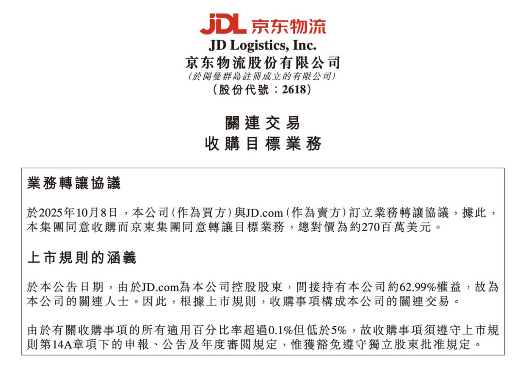 公司情报专家《财经涂鸦》获悉,10月8日,京东物流发布公告称,已与JD.com(京东集团)订立业务转让协议。 根据协议,京东物流将收购JD.com旗下从事本地即时配送服务业务的全资子公司,即达疆及达盛,总对价约270百万即2.7亿美元。 公告称,随着京东本地即时配送服务业务的新发展,集团已招募全职骑手参与该等配送服务。鉴于目标业务过去数月的表现,公司认为目标业务具备商业 潜力及进一步拓展业务的机会。 在选择可比公司时,估值顾问选择全球快递及即时配送公司,并透过筛选地理范围、商业模式、收入结构、数据可用性等条件,同时排除异常值,将范围 缩小至五家最终可资比较公司,以得出最近十二个月市盈率倍数。 上述五家公司分别为顺丰(002352.SZ)、中通(ZTO.US)、申通(600233.SH)、韵达(002120.SZ)、圆通(002468.SZ),最近十二个月市盈率倍数 分别为21.9、11.3、11.6、13.1、15.3,中位数为13.1。 以13.1倍市盈率为基础,经20.4%的缺乏市场流通性折让及23.7%的控制权溢价调整后,并估计目标业务于估值日期按非流通资产以及存在控制权溢价的基 础,估值顾问评估出目标 ...