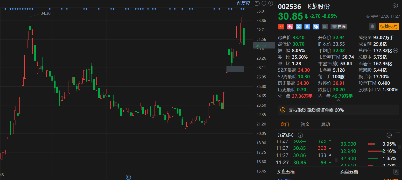 A股异动丨股东减持,飞龙股份回调超8%,月内最高涨幅达55%