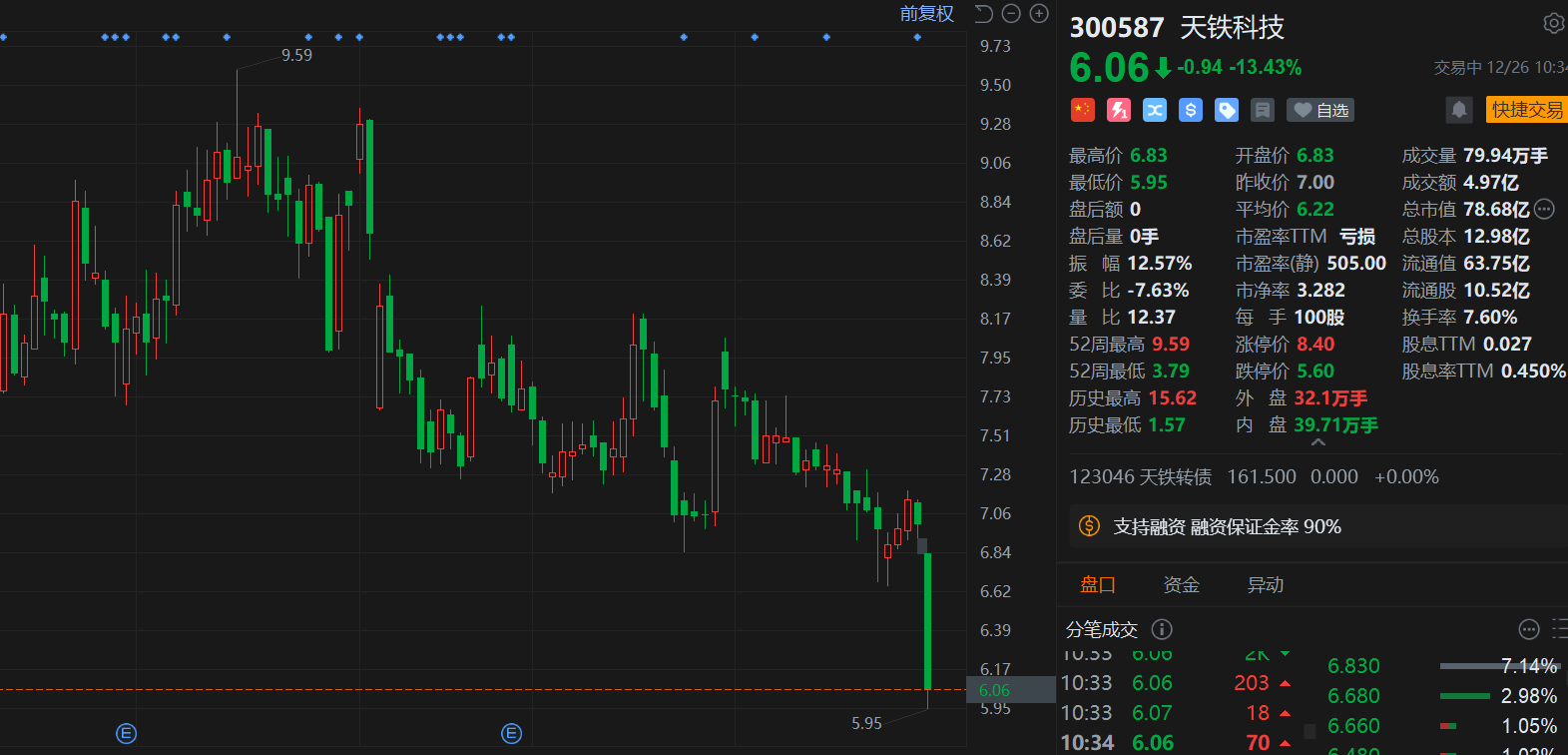 A股异动丨实控人被刑事拘留,天铁科技大跌超14%,股价跌破6元关口