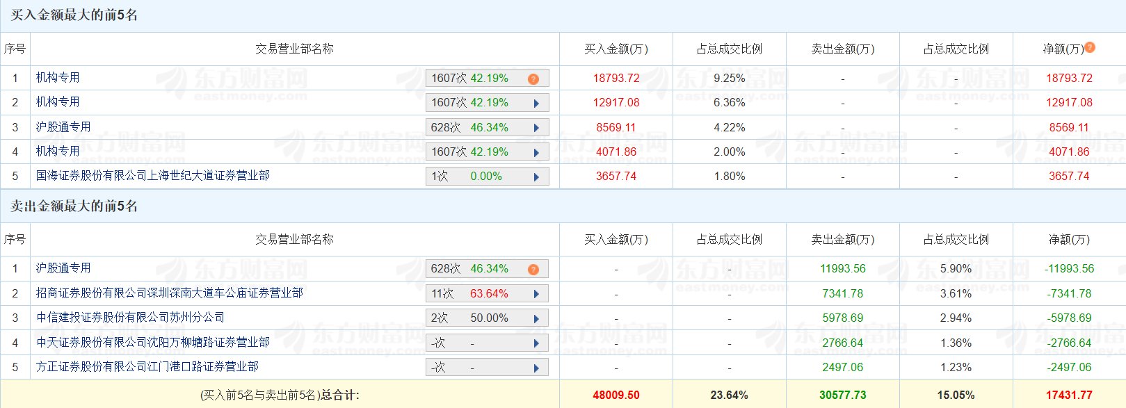 | 序号 | 交易营业部名称 | | 买入金额(万) | 占总成交比例 | | --- | --- | --- | --- | --- | | | 沪股通专用 | 628次 46.34% (7) | | | | 2 | 招商证券股份有限公司深圳深南大道车公庙证券营业部 | 11次 63.64% | | | | 3 | 中信建投证券股份有限公司苏州分公司 | 2次 50.00% | | | | 4 | 中天证券股份有限公司沈阳万柳塘路证券营业部 | -次 - | | | | 5 | 方正证券股份有限公司江门港口路证券营业部 | -次 - | | | | | (买入前5名与卖出前5名)总合计: | | 48009.50 | 23.64% | 格隆汇10月9日|灿芯股份(688691.SH)今日20%涨停,换手率23.69%,成交额20.31亿元。龙虎榜数据显示,三家机构位列买一、买二及买四席位,买入3.58 亿元;游资"温州帮"位列卖二席位,卖出7342万元。上榜席位全天买入4.8亿元,卖出3.06亿元,合计净买入1.74亿元。(格隆汇) | 买入金额最大的前5名 | | | | | | --- | --- | ...