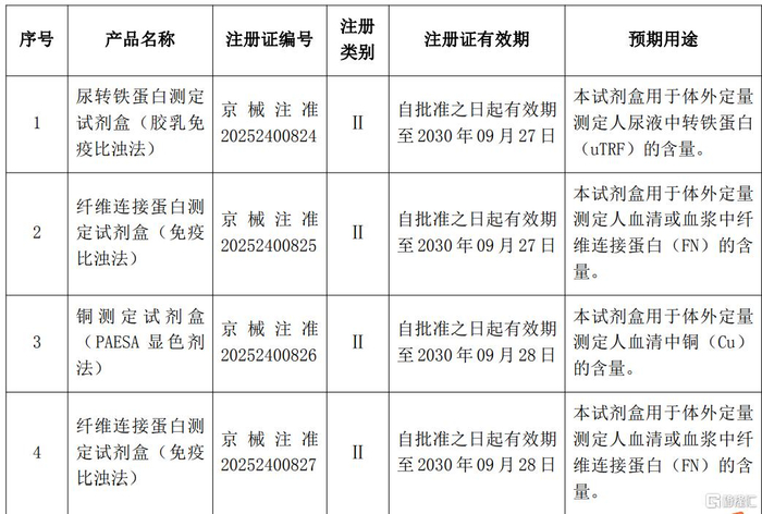 | 序号 | 产品名称 | 注册证编号 | 注册 类别 | 注册证有效期 | 预期用途 | | --- | --- | --- | --- | --- | --- | | 1 | 尿转铁蛋白测定 试剂盒(胶乳免 | 京 械 注 准 | II | 自批准之日起有效期 | 本试剂盒用于体外定量 测定人尿液中转铁蛋白 | | | 疫比浊法) | 20252400824 | | 至2030年09月27日 | (uTRF)的含量。 | | | 纤维连接蛋白测 | 京 械 注 准 | | 自批准之日起有效期 | 本试剂盒用于体外定量 测定人血清或血浆中纤 | | 2 | 定试剂盒(免疫 比浊法) | 20252400825 | II | 至2030年09月27日 | 维连接蛋白(FN)的含 | | | | | | | n. | | | 铜测定试剂盒 (PAESA 显色剂 | 京 械 注 准 | II | 自批准之日起有效期 | 本试剂盒用于体外定量 测定人血清中铜(Cu) | | 3 | | 20252400826 | | 至2030年09月28日 | | | | 法) | | | | 的含量。 | | | 纤维连接蛋白 ...