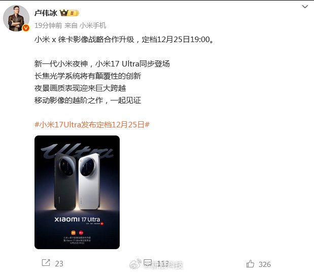 【#小米17Ultra将于12月25日发布#】卢伟冰今日宣布,小米 x 徕卡影像战略合作升级,定档12月25日 19:00,与此同时,小米17 Ultra同步登场。 ...