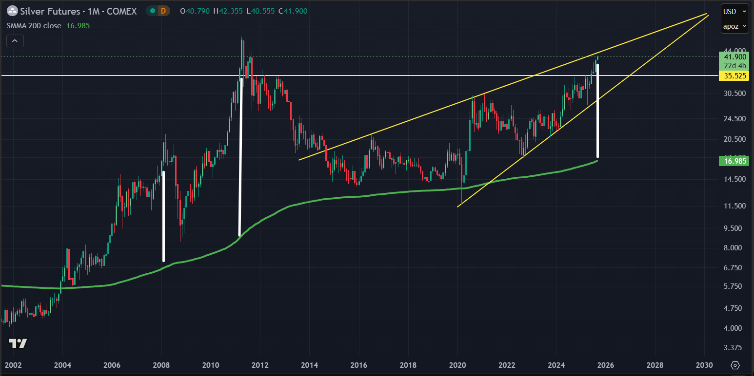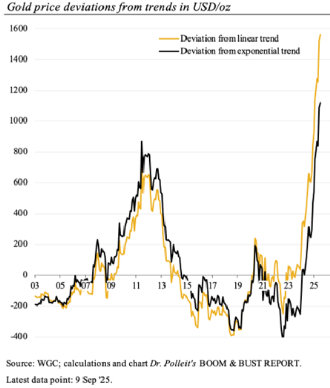 贵金属价格表现 - 黄金价格创历史新高突破3660美元/盎司 同比上涨45% 两年累计涨幅达90% [1] - 白银价格攀升至41美元/盎司上方 同比上涨45% 两年累计上涨80% [1] - 当前金价较21世纪伊始线性趋势线高出42%(1550美元/盎司) 按指数趋势仍高30%(1100美元/盎司) [1] 价格驱动因素 - 央行降息预期、国际金融体系紧张及政府信用质疑动摇法币信心 推动金银需求增长 [4] - 投资风险攀升推高"保险溢价" 投资者愿为对冲价值支付更高溢价 [5] - 西方政府负债过度丧失市场信任 经济生产率增长放缓 央行印钞引发通胀预期 [5] 贵金属职能特性 - 金银具工业需求与"类货币"职能 在全球法币体系承压时被视为安全港资产 [4] - 黄金持续超越其他贵金属 2000年1月至2025年9月以美元计价年均涨幅达10.7% [5] - 历史证明金银可防护法币购买力流失风险 应对政府与银行机构违约风险 [6] 未来价格展望 - 金价可能短期触及4000美元/盎司(较现价涨9%) 白银或至48美元/盎司(涨17%) [6] - 若涨势延续 2026年底金价或达5500美元/盎司 银价逼近80美元/盎司 [6] - 欧元区经济恶化(德国下滑/法国债务危机)可能推动金银价格迈向更高区间 [6]