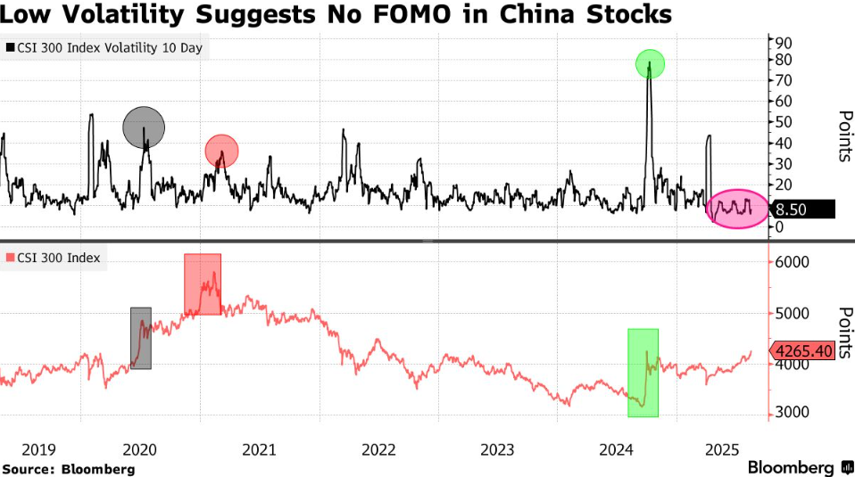低波动率表明中国股市尚未出现FOMO 西部证券首席策略分析师曹柳龙等在报告中写道:"虽然有些投资者在讨论存款加速流向股市,但我们的观察显示,高净值投资者确实在 涌入,但大多数个人投资者选择的是理财产品,而非直接购买股票或公募基金。" 他们补充说,小额交易也表明散户参与度不高。一些家庭正转向股市寻求更高回报,但散户投资者尚未争相买入股票。彭博汇编数据显 示,截至8月15日,以股票为主的中国交易所交易基金(ETF)已连续八周遭遇资金外流,尽管沪深300指数在此期间上涨逾9%。与此同 时,固定收益ETF持续获得资金流入,货币市场基金赎回规模不大。 中国股市近期的上涨行情可能比以往更具持久力,因为散户投资者尚未出现狂热情绪,这有助于降低群体性追涨杀跌带来的风险。 分析师表示,虽然上证综指周一升至十年来高点部分得益于资金充裕的投资者寻求比债券更高的收益,但他们的建仓步伐较以往股市上 涨时期更为审慎。 衡量市场波动率的沪深300指数10日历史波动率仅比今年低点高出几个点,远低于去年10月的高点。这一趋势让人对股市更可持续的上涨 抱有希望,这可能有助于恢复投资者的信心。 居民储蓄出现了向股市转移的初步迹象 值得注意的是,本 ...