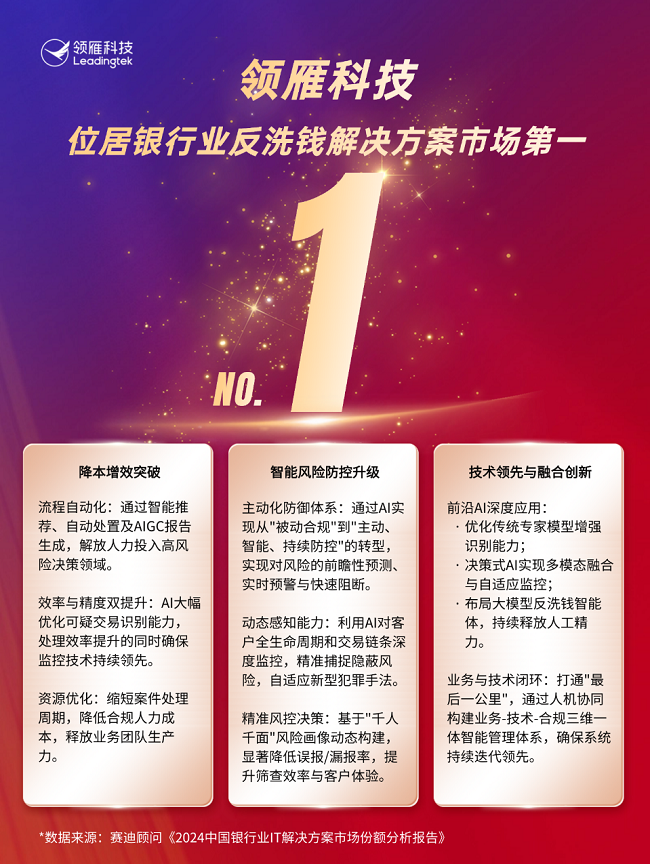 反洗钱AI深度应用时代,领雁反洗钱稳居银行IT市场第一