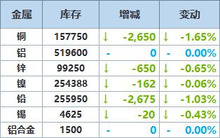 》查看更多金属库存信息 LME铜库存 | 地点 | | | 前日库存 入库 出库 今日库存 | | 变动 | 注册仓单 | 注销仓单 | 注销占比 | | --- | --- | --- | --- | --- | --- | --- | --- | --- | | 铜 | 160400 | | 2050 4700 157750 | | -2650 | 106000 | 51750 | 32.81% | | 高雄 | 77650 | 300 | 275 | 77675 | +25 | 48525 | 29150 | 37.53% | | 光阳 | 39375 | 0 | 1500 | 37875 | -1500 | 19625 | 18250 | 48.18% | | 鹿特丹 | 11275 | 0 | 0 | 11275 | 0 | 10775 | 500 | 4.43% | | हैं। | 12275 | | 1750 2875 | 11150 | -1125 | 9625 | 1525 | 13.68% | | 糖 | 10575 | 0 | 0 | 10575 | 0 | 8500 | 2075 | ...