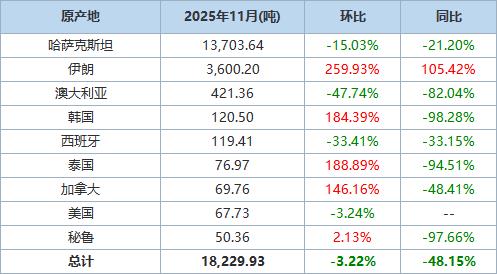 | 后在 | 2025年11月(吨) | 环比 | 同比 | | --- | --- | --- | --- | | 哈萨克斯坦 | 13.703.64 | -15.03% | -21.20% | | 伊朗 | 3.600.20 | 259.93% | 105.42% | | 澳大利亚 | 421.36 | -47.74% | -82.04% | | 草玉 | 120.50 | 184.39% | -98.28% | | 西班牙 | 119.41 | -33.41% | -33.15% | | 泰国 | 76.97 | 188.89% | -94.51% | | 加拿大 | 69.76 | 146.16% | -48.41% | | 美国 | 67.73 | -3.24% | | | 秘鲁 | 50.36 | 2.13% | -97.66% | | 总计 | 18,229.93 | -3.22% | -48.15% | 数据来源:海关总署 注:1、精炼锌包括含锌量≥99.995%的未锻轧非合金锌;99.99%≤含锌量<99.995%的未锻轧非合金锌; 含锌量低于99.99%的未锻轧非合金锌。 2、进口/出口总 ...