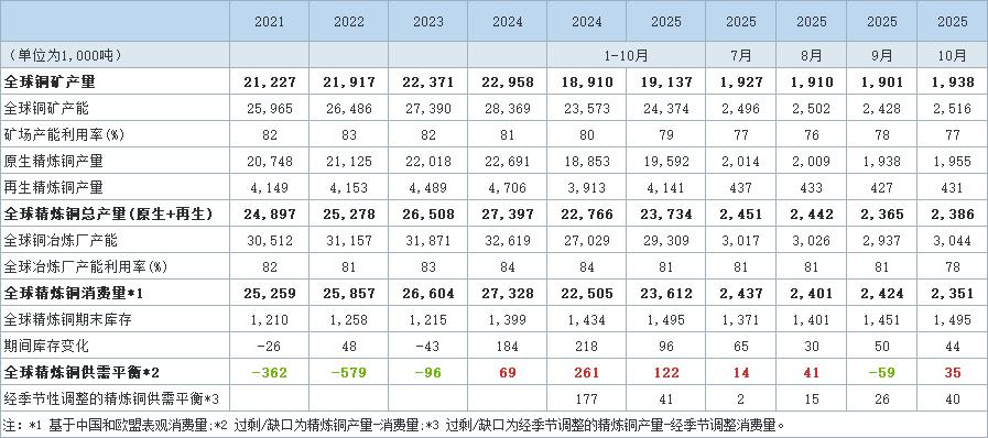 全球精炼铜供需平衡 - 2025年1-10月全球精炼铜市场供应过剩12.2万吨,较上年同期供应过剩26.1万吨的规模显著收窄[1] - 2025年1-10月全球精炼铜供需平衡为12.2万吨过剩,而2024年同期为26.1万吨过剩[3] - 从月度数据看,2025年7月至10月的供需平衡波动较大,分别为过剩1.4万吨、过剩4.1万吨、短缺5.9万吨和过剩3.5万吨[3] 全球精炼铜产量 - 2025年1-10月全球精炼铜总产量为2373.40万吨,较上年同期的2276.60万吨增长4.3%[1] - 全球精炼铜总产量由原生精炼铜和再生精炼铜构成,2025年1-10月原生精炼铜产量为1959.2万吨,再生精炼铜产量为414.1万吨[3] - 2025年1-10月全球冶炼厂产能利用率为81%,较2024年同期的84%有所下降[3] 全球精炼铜消费量 - 2025年1-10月全球精炼铜消费量为2361.20万吨,较上年同期的2250.50万吨增长4.9%[2] - 2025年1-10月经季节性调整的精炼铜供需平衡为4.1万吨过剩,远低于2024年同期的17.7万吨过剩[3] 全球铜矿供应 - 2025年1-10月全球铜矿产量为1913.7万吨,较上年同期的1891.0万吨增长1.2%[3] - 2025年1-10月全球铜矿产能利用率为79%,较上年同期的80%略有下滑[3] - 2025年10月全球铜矿产量为193.8万吨,产能利用率为77%[3] 全球精炼铜库存 - 截至2025年10月,全球精炼铜期末库存为149.5万吨,高于2024年同期的143.4万吨[3] - 2025年1-10月期间库存变化为增加9.6万吨,而2024年同期为增加21.8万吨[3]