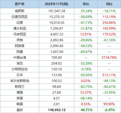 以下为根据海关总署官网数据整理的2025年11月原铝进口分项数据一览表: | 原产地 | 2025年11月(吨) | 环比 | 同比 | | --- | --- | --- | --- | | 俄罗斯 | 101,947.38 | -35.34% | -18.71% | | 印度尼西亚 | 15,270.10 | -58.09% | 112.19% | | 印度 | 10,018.50 | -47.73% | 256.86% | | 澳大利亚 | 7,296.87 | -31.87% | 145.99% | | 三四米四 | 4,807.32 | 12.91% | 179.52% | | 伊朗 | 2,492.86 | -28.06% | -61.16% | | 阿联酋 | 2,090.40 | -58.53% | - - | | 阿盖 | 1,607.00 | -69.67% | -- | | 贺知国壮 | 700.00 | -- | 3734.78% | | 埃及 | 204.02 | -22.28% | -- | | 沙特阿拉伯 | 150.10 | -0.78% | -- | | 日本 | 133.9 ...
