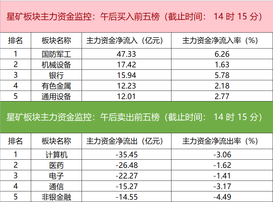 主力资金监控:国防军工板块净流入超47亿 智通财经8月4日电,智通财经星矿数据显示,今日主力资金净流入国防军工、机械设备、银行等板块,净流出计算机、医药、电子 等板块,其中国防军工板块净流入超47亿元。个股方面,建设工业涨停,主力资金净买入5.77亿元位居首位,长城军工、航天电 子、山河智能主力资金净流入居前;中际旭创遭净卖出超6亿元位居首位,海康威视、胜宏科技、西藏天路主力资金净流出额居前。 | 排名 | 板块名称 | 主力资金净流入(亿元) | 主力资金净流入率(%) | | --- | --- | --- | --- | | | 国防军工 | 47.33 | 6.26 | | 2 | 机械设备 | 17.42 | 1.63 | | 3 | 银行 | 15.94 | 5.78 | | য | 有色金属 | 12.23 | 2.18 | | 5 | 通用设备 | 12.01 | 2.77 | | 排名 | 板块名称 | 主力资金净流出(亿元) | 主力资金净流出率(%) | | --- | --- | --- | --- | | – | 计算机 | -35.45 | -3.06 | | 2 | 矢药 | - ...
