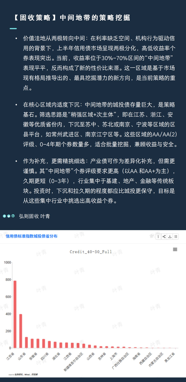 弘则固收叶青发表研报,信用债市场两极分化,价值洼地已转向收益率30%-70%的"中间地带"。核心策 略是在强省份(如江苏、浙江)内,向区县的AA/AA(2)城投进行区域下沉;同时,可谨慎配置更高评级、 更短久期的特定产业债作为补充。 价值洼地从两极转向中间:在利率缺乏空间、机构行为驱动信用的背景下,上半年信用债市场呈现两极 分化,高低收益率个券表现突出。当前,收益率位于30%-70%区间的"中间地带"表现平平,反而构成了 新的性价比来源。这一区域是基于市场现有格局推导出的、最具挖掘潜力的新方向,是当前策略的重 点。 在核心区域内适度下沉:中间地带的城投债存量巨大,是策略基石。筛选思路是"稍强区域+次主体", 即在江苏、浙江、安徽等优质省份内,下沉至苏中、苏北或南京、宁波等区域的区县平台,如常州武进 区、南京江宁区等。这些区域的AA/AA(2)评级、0-4年期个券数量多,适合批量挖掘,兼顾收益与安 全。 作为补充,更需精挑细选:产业债可作为差异化补充,但需更谨慎。其"中间地带"个券评级要求更高 (以AA 和AA+为主),久期更短(0-3年),行业集中于基建、地产、金融等传统板块。投资时,下沉和拉 久期的程度都应 ...