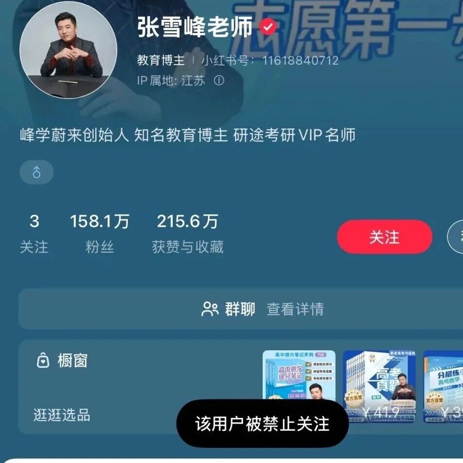 记者 | 朱芷葵 编辑 | 叶映橙 9月24日,21财经·南财快讯记者发现张雪峰账号在微博、小红书、抖音和B站平台均被禁止关 注。 张雪峰微博账号 : 张雪峰小红书账号 : 张雪峰抖音账号 : 张雪峰B站账号 : 同日,据 《正在新闻》报道, 张雪峰(本名张子彪)告诉 记者,"禁止关注是账号问题",随 后便挂断了电话。 出品 | 2 1财经客户端 南财快讯工作室 编辑 | 金珊 实习生林芷仪 2%大额存单一上架秒没 蜜雪冰城柠檬水陷入供应危机 SFC 21君荐读 ...