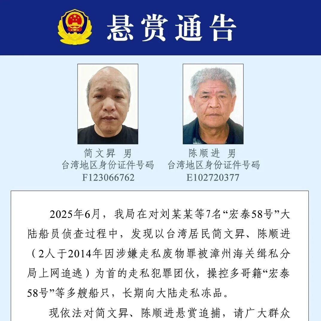 12月24日,山东省威海市公安局发布悬赏通告称,该局6月在对刘某某等7名"宏泰58号"大陆船员侦查过程中,发现 以台湾居民简文昇、陈顺进为首的走私犯罪团伙,操控多哥籍"宏泰58号"等多艘船只,长期向大陆走私冻品。 通告还披露,简文昇、陈顺进于2014年因涉嫌走私废物罪被福建漳州海关缉私分局上网追逃。 威海市公安局依法对上述2人悬赏追捕,请广大群众积极提供线索,该局将视情给予5万元至25万元奖励。 以下为通告详情—— 今年2月26日,国务院台办例行记者会上,有记者问:台有关部门称,有大陆背景的多哥籍"宏泰"货轮涉拖断台澎第 3海缆,以所谓"现行犯"拦停该轮。对此有何评论? 国台办发言人朱凤莲:全球每年约发生百余起海底光缆损坏事件,是常见海上事故。民进党当局在基本事实、事故 责任尚未厘清的情况下,刻意渲染,企图政治操弄,不得人心。 今年4月16日,国务院台办例行记者会上,有记者问,2月25日,大陆背景权宜轮多哥籍"宏泰"货轮涉拖断台澎第三 海缆,目前王姓船长被羁押禁见遭起诉,其他7名船员遣送出境。请问国台办方面是否有收到台湾方面的相关通报? 利好来了!摩尔线程,重磅发布 降息,大消息! 违法和不良信息举报电话:0 ...