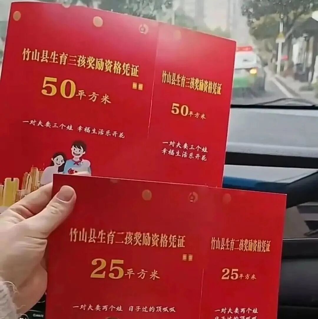 据第一财经报道,近日,有网友晒出一张"竹山县生育二孩奖励资格凭证"和一张"竹山县生育三孩奖励资格凭 证",称湖北十堰竹山县针对生育二孩、三孩家庭给予购房奖补。 12月25日,竹山县卫生健康局工作人员表示,当地的确有该政策,具体是二孩奖补25平方米、三孩奖补50平方 米,两项还可叠加使用,具体要求以官方文件为准,目前市民反响普遍较好。 经过查询,记者看到,早在2024年,竹山县政府官网就发布了"购房补贴、生育奖补 ... ...黄金十条助力竹山城 镇化发展!"的文件,其中在鼓励生育措施一项中提到,2021年6月1日至2026年6月1日期间生育的二孩、三孩 家庭,从发文之日(2023年11月9日)起至2024年12月31日期间,在竹山县城区指定楼盘购买新建商品住房 的,生育二孩购房奖补25平方米,生育三孩购房奖补50平方米,可叠加计算。 今年3月,竹山县政府官网又发布一则关于印发《竹山县以县城为重要载体就地城镇化2025年政策措施》的通 知。其中生育二孩、三孩家庭奖补措施一项指出,自2021年6月1日起至2025年12月31日,夫妻一方属竹山户籍 且生育二孩、三孩家庭,在竹山县城区指定楼盘购买新建商品住房的,生育 ...