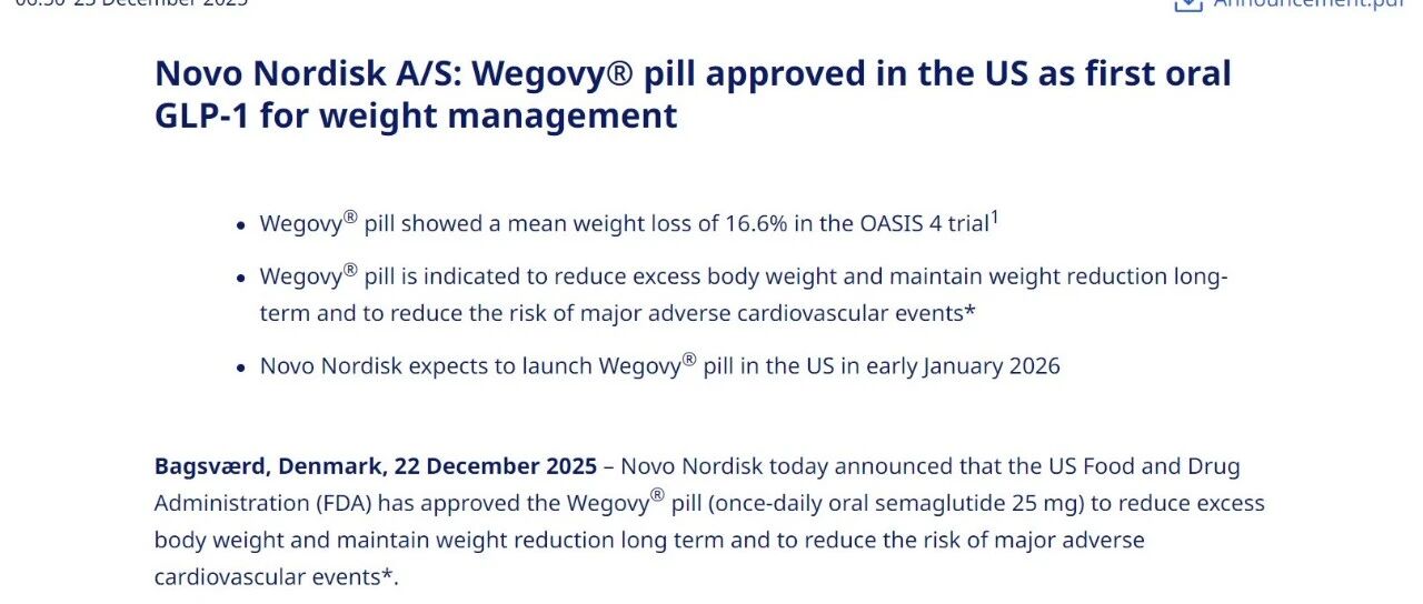 整理 | GLP1减重宝典内容团队 2025年12月22日,诺和诺德宣布,其口服司美格鲁肽片剂Wegovy已获得美国食品药品监督管理局批准,用于减轻超重体重、长期维持减重效 果,并降低主要不良心血管事件发生风险。这一产品为每日一次、25毫克剂量,是全球首款获批用于体重管理的口服GLP-1受体激动剂疗法。 安全性方面,OASIS 4再次验证了司美格鲁肽已知的耐受性特征,与既往用于体重管理的临床结果一致,未出现新的安全信号。 这一批准节点,标志着减重药物竞争进入全新阶段。继注射剂型迅速放量后,口服方案首次在疗效、安全性与监管层面同时成立,意味着减重 治疗正在从阶段性干预,转向更接近慢病管理的长期用药模式。 受此消息影响,诺和诺德股价盘后大涨10%。 点击关注,追踪最新GLP-1资讯 ▍16.6%的数字背后:口服首次"对齐"注射疗效 此次获批的核心依据,来自OASIS临床试验项目与SELECT心血管结局研究数据。其中,OASIS 4试验成为决定性证据。 在该Ⅲb期试验中,纳入了307名肥胖或超重、且合并至少一种并发症的成年受试者。结果显示,每日坚持服用25毫克口服司美格鲁肽,64周后 平均减重比例达到16.6%,与 ...