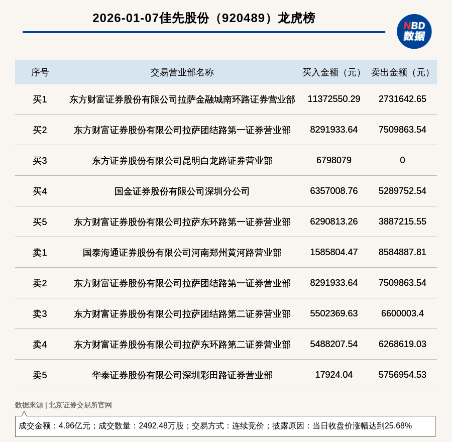 (记者 曾健辉) 免责声明:本文内容与数据仅供参考,不构成投资建议,使用前核实。据此操作,风险自担。 每日经济新闻 每经讯,2026年1月7日,北交所上市公司佳先股份(920489,收盘价:20.8元)登上龙虎榜,交易方式是连续竞价,披露原因是 当日收盘价涨幅达到25.68%,成交数量2492.48万股,成交金额4.96亿元。买一席位为东方财富证券股份有限公司拉萨金融城南 环路证券营业部,买入1137.26万元;卖一席位为国泰海通证券股份有限公司河南郑州黄河路营业部,卖出858.49万元。 | | 2026-01-07佳先股份(920489) | | | | --- | --- | --- | --- | | 序号 | 交易营业部名称 | 买入金额(元) | 卖出金额(元) | | يار آهي | 东方财富证券股份有限公司拉萨金融城南环路证券营业部 | 11372550.29 | 2731642.65 | | 买2 | 东方财富证券股份有限公司拉萨团结路第一 证券营业部 | 8291933.64 | 7509863.54 | | 址3 | 东方证券股份有限公司昆明白龙路证券营业部 | 6798079 | ...