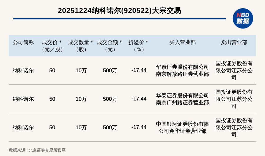 (记者 张明双) 免责声明:本文内容与数据仅供参考,不构成投资建议,使用前核实。据此操作,风险自担。 每日经济新闻 每经讯,2025年12月24日,北交所上市公司纳科诺尔(920522,收盘价:60.56元)发生3笔大宗交易,总成交金额为1500万元, 成交金额最高的一笔成交价50元/股,成交数量10万股,成交金额500万元,折价17.44%。买入营业部是华泰证券股份有限公司 南京解放路证券营业部,卖出营业部是国投证券股份有限公司江苏分公司。 | | | | 20251224纳科诺尔(920522)大宗交易 | | | | | --- | --- | --- | --- | --- | --- | --- | | 公司简称 | 成交价 * (元/股) | 成交数量* 成交金额 * (股) | (元) | 折溢价 * (%) | 买入营业部 | 卖出营业部 | | 纳科诺尔 | 50 | 10万 | 500万 | -17 44 | 华泰证券股份有限公司 南京解放路证券营业部 | 国投证券股份有 限公司江苏分公 로 | | 纳科诺尔 | 50 | 10万 | 500万 | -17 44 | 华泰证券股份有限公司 ...