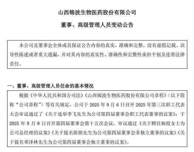 公司人事任命 - 公司于2025年9月8日聘任杨霞为总经理 任期至2027年7月31日 [1] - 杨霞自2016年12月起担任公司董事长 2019年12月起兼任研究院院长 [1] - 杨霞为公司控股股东及实际控制人 持有公司67,766,972股股份 [1] 高管背景信息 - 杨霞为中国国籍 1974年9月出生 拥有硕士研究生学历 [1] - 2008年1月至2016年11月曾任山西医科大学讲师 [1] - 2008年3月至2015年3月期间先后担任公司执行董事及监事职务 [1]
