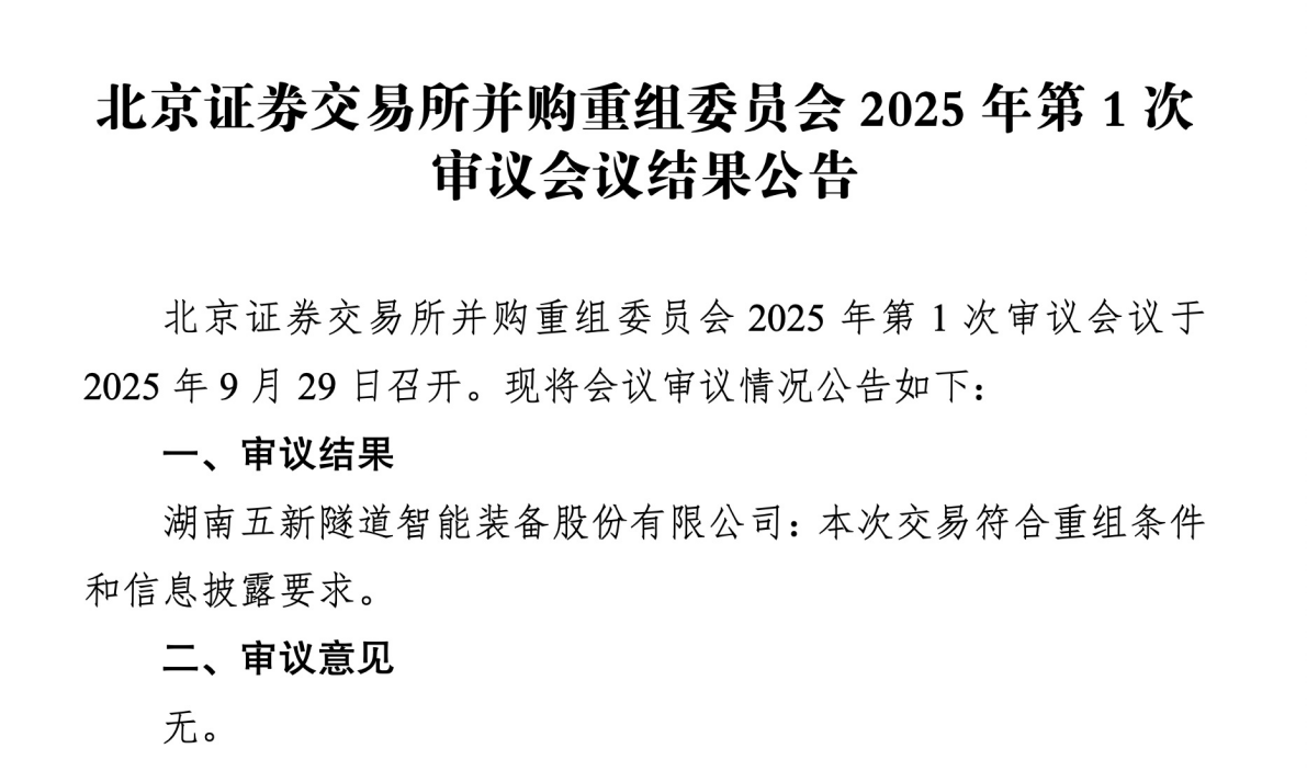 登录新浪财经APP 搜索【信披】查看更多考评等级 来源:上海证券报·中国证券网 上证报中国证券网讯(记者 张雪)北京证券交易所并购重组委员会2025年第1次审议会议结果9月29日 披露,五新隧装发行股份及支付现金购买资产并募集配套资金事项获得审议通过。该案例是北交所"并 购六条"发布后首单顺利过会的发股购买资产项目,标志着北交所并购重组机制落地见效,市场功能持 续优化。 根据北交所公告,本次会议于2025年9月29日召开,审议认为五新隧装本次交易"符合重组条件和信息披 露要求",未提出附加审议意见。审议过程中,重组委重点关注了标的资产评估估值的合理性、业绩承 诺的可实现性及并购后整合措施的可行性等问题,要求公司及中介机构作出说明和核查。 据了解,五新隧装此次并购涉及收购兴中科技与五新重工两家公司。兴中科技主营交通基建专用设备, 五新重工则聚焦港口物流智能装备领域,二者与五新隧装现有的隧道智能装备业务形成有效协同,有望 共同构建覆盖隧道、港口、交通等多场景的基建工程装备服务体系。 根据披露信息,本次交易完成后,五新隧装的营收规模与盈利能力将得到显著提升,兴中科技和五新重 工分别在交通基建专用设备领域和港口物流智 ...
