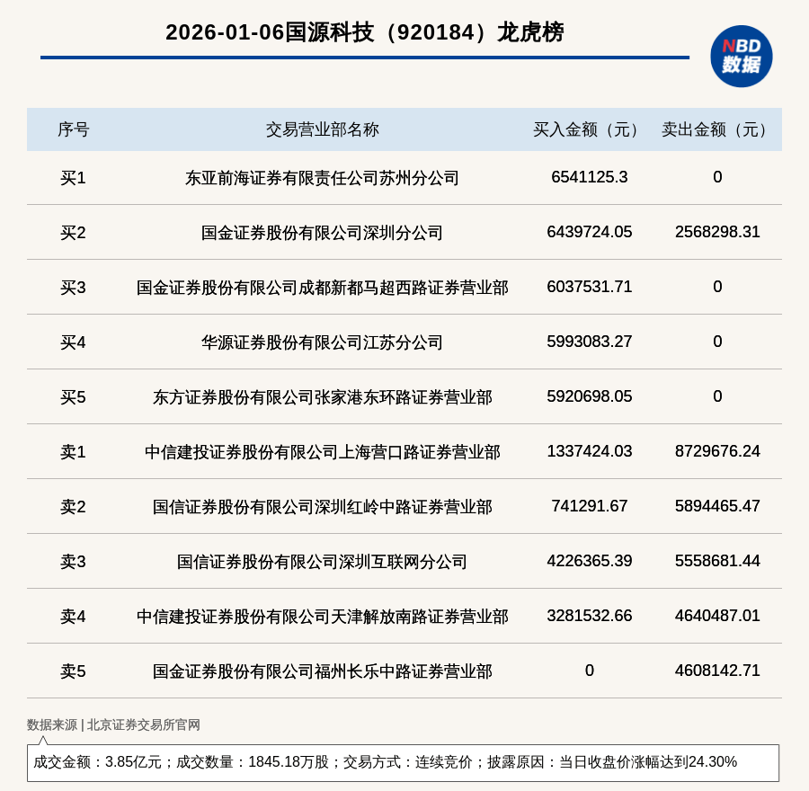 每经讯,2026年1月6日,北交所上市公司国源科技(920184,收盘价:22.35元)登上龙虎榜,交易方式是连续竞价,披露原因 是当日收盘价涨幅达到24.30%,成交数量1845.18万股,成交金额3.85亿元。买一席位为东亚前海证券有限责任公司苏州分公 司,买入654.11万元;卖一席位为中信建投证券股份有限公司上海营口路证券营业部,卖出872.97万元。 | | 2026-01-06国源科技 (920184) 龙虎榜 | | | | --- | --- | --- | --- | | 序号 | 交易营业部名称 | 买入金额(元) | 卖出金额(元) | | ਜੇਵ ਹ | 东亚前海证券有限责任公司苏州分公司 | 6541125.3 | 0 | | 买2 | 国金证券股份有限公司深圳分公司 | 6439724.05 | 2568298.31 | | 买3 | 国金证券股份有限公司成都新都马超西路证券营业部 | 6037531.71 | 0 | | द्र 4 | 华源证券股份有限公司江苏分公司 | 5993083.27 | 0 | | ન્નેર | 东方证券股份有限公司张家港东环路证券营业部 | 592 ...
