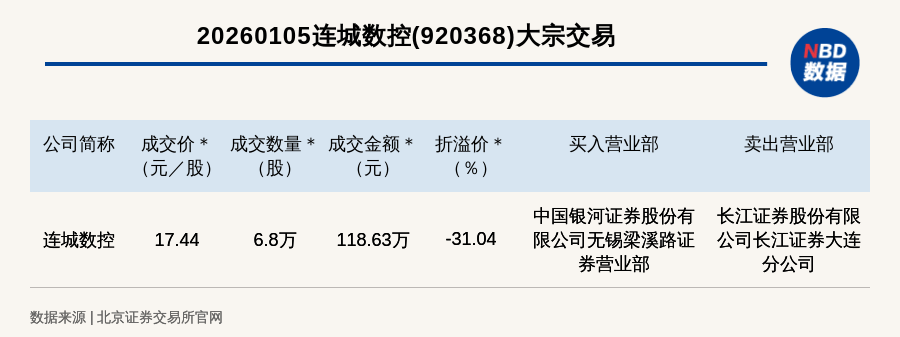 北交所上市公司连城数控大宗交易折价31.04%,成交金额118.63万元