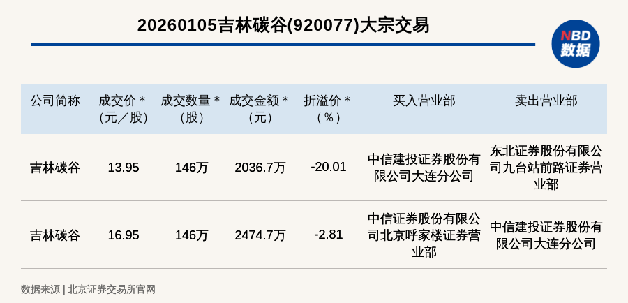 (记者 曾健辉) 免责声明:本文内容与数据仅供参考,不构成投资建议,使用前核实。据此操作,风险自担。 每日经济新闻 每经讯,2026年1月6日,北交所上市公司吉林碳谷(920077,收盘价:17.06元)发生2笔大宗交易,折价率最高的一笔成交价 13.65元/股,成交数量146万股,成交金额1992.9万元,折价19.99%。买入营业部是中信建投证券股份有限公司大连分公司,卖 出营业部是东北证券股份有限公司九台站前路证券营业部。 | | | | 20260106吉林碳谷(920077)大宗交易 | | | | | --- | --- | --- | --- | --- | --- | --- | | 公司简称 | 成交价 * (元/股) | (股) | 成交数量* 成交金额 * (元) | 折溢价 * ( % ) | 买入营业部 | 卖出营业部 | | 吉林碳谷 | 13.65 | 146万 | 1992 9万 | -19.99 | 中信建投证券股份有 限公司大连分公司 | 东北证券股份有限公 司九台站前路证券营 业部 | | 吉林碳谷 | 16.58 | 146万 | 2420.68万 | -2.81 | ...
