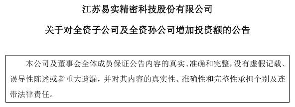 公司公告 - 易实精密于12月23日发布公告 [2] - 公司第四届董事会第九次会议审议通过一项议案 [2] - 议案内容为对全资子公司及全资孙公司增加投资额 [2]