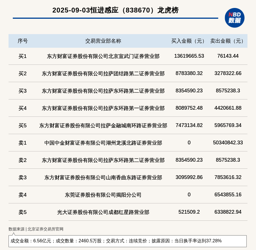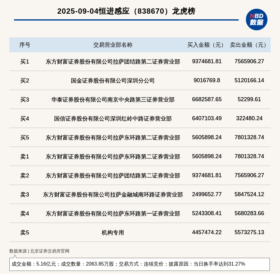交易概况 - 恒进感应于2025年9月4日因换手率达31.27%登上北交所龙虎榜 成交数量2063.85万股 成交金额5.16亿元[1] - 交易方式为连续竞价 收盘价26.03元[1] 资金流向 - 买一席位东方财富证券拉萨团结路第二营业部买入937.47万元 同时该席位以卖二身份卖出756.59万元[1][2] - 卖一席位东方财富证券拉萨东环路第二营业部卖出780.13万元 同时该席位以买五身份买入560.59万元[1][2] - 机构专用席位买入445.75万元 同时卖出557.33万元[2] - 国金证券深圳分公司买入901.68万元 卖出512.02万元[2] - 华泰证券南京中央路第三营业部买入668.26万元 卖出5.23万元[2] - 国信证券深圳红岭中路营业部买入640.71万元 卖出32.25万元[2]
