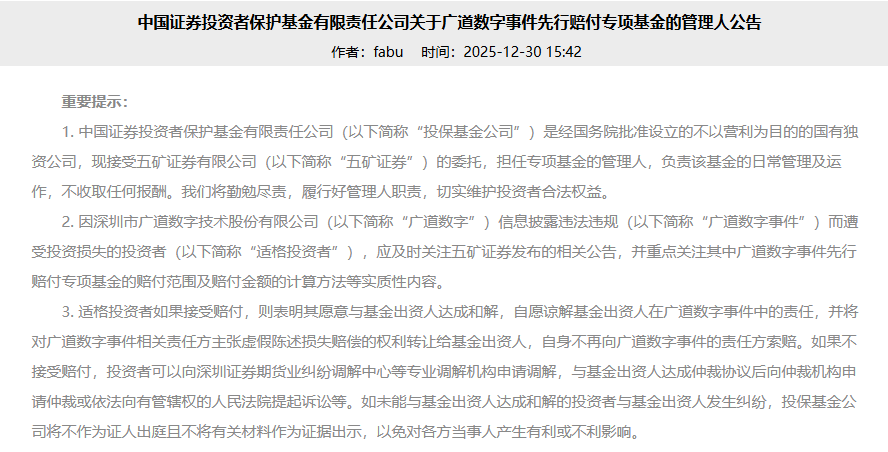 事件概述 - 中国证券投资者保护基金有限责任公司接受五矿证券委托 担任广道数字事件先行赔付专项基金管理人 负责基金日常管理及运作且不收取报酬 [1] - 专项基金由五矿证券出资设立 用于赔付因广道数字信息披露违法违规而遭受投资损失的适格投资者 [4][5] 专项基金设立与管理 - 专项基金设立出资规模为人民币2.1亿元 最终规模将根据完成有效申报的适格投资者损失赔付金额进行调整 [5] - 专项基金存续期限为自成立之日起3个月 管理人可根据运作实际情况延长期限 [5] - 专项基金资金监管银行为兴业银行股份有限公司北京分行 [5] - 存续期限届满后 管理人将聘请独立第三方会计师事务所进行审计并组织清算 [5] 赔付安排与投资者选择 - 赔付资金计划于2026年3月12日起划付 适格投资者应于2026年3月23日至3月31日查询到账情况 [5] - 接受赔付的投资者 表明其与基金出资人达成和解 自愿谅解其责任 并将向相关责任方索赔的权利转让给基金出资人 [4] - 不接受赔付的投资者 可申请调解、仲裁或提起诉讼 但投保基金公司不会作为证人或出示相关材料 [4] 投资者注意事项 - 遭受损失的投资者应及时关注五矿证券发布的相关公告 重点关注赔付范围及赔付金额计算方法等实质性内容 [4] - 赔付资金将通过中国证券登记结算有限责任公司北京分公司或监管银行划付至投资者确认的银行账户 [5]