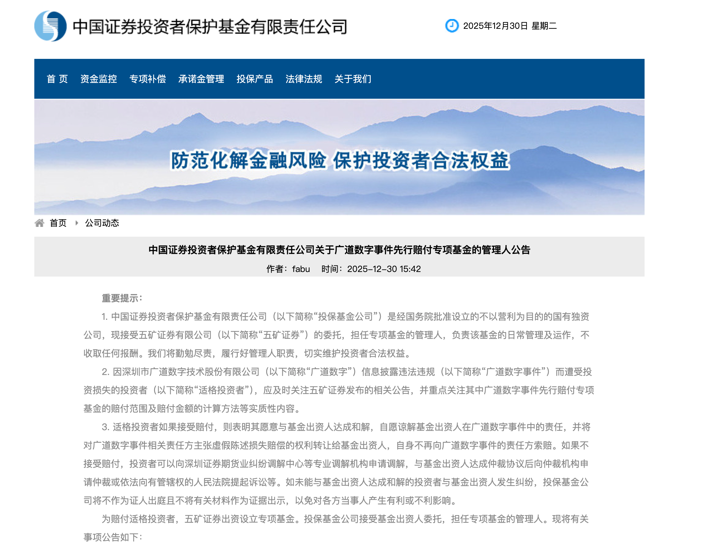 投保基金公司:广道数字事件先行赔付专项基金已设立 适格投资者可关注赔付范围及金额
